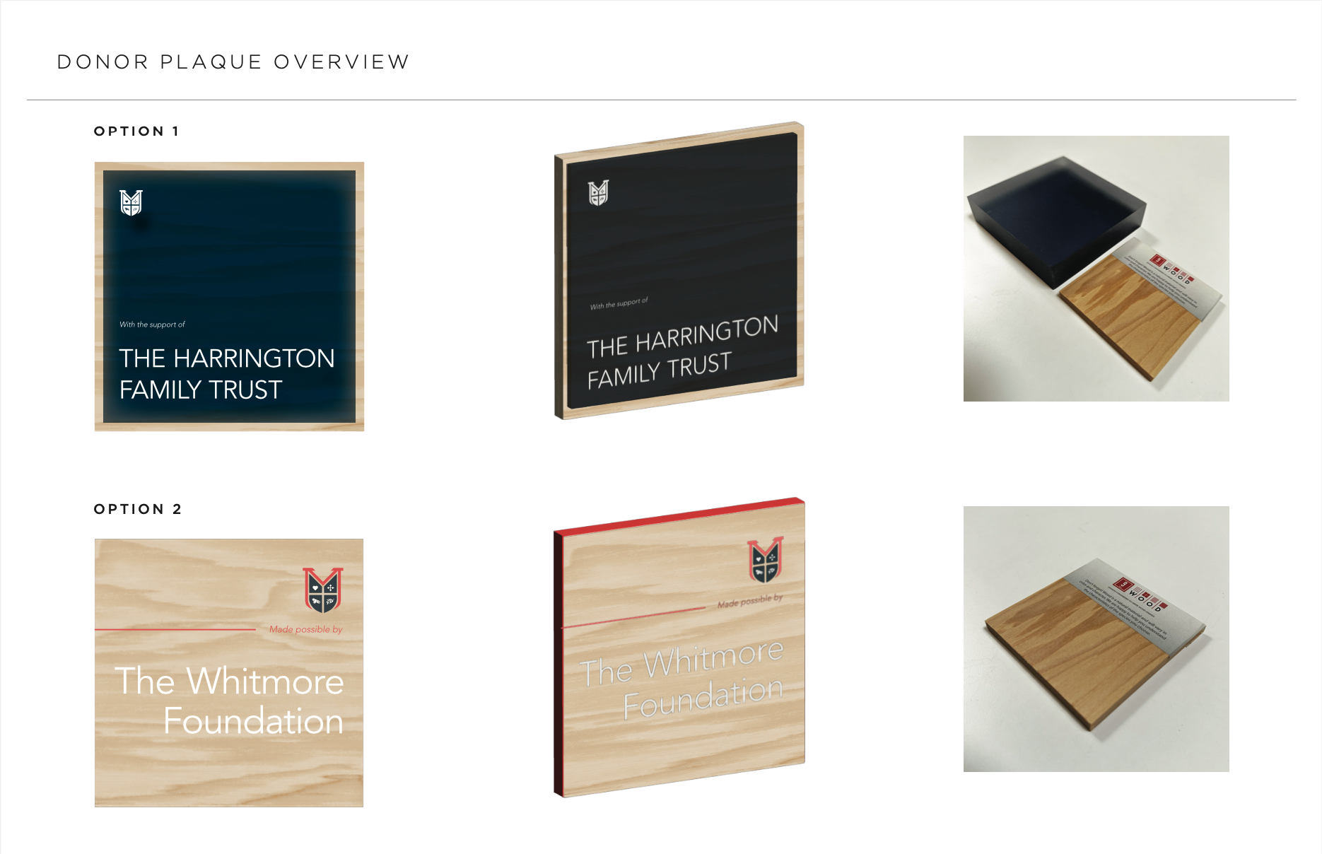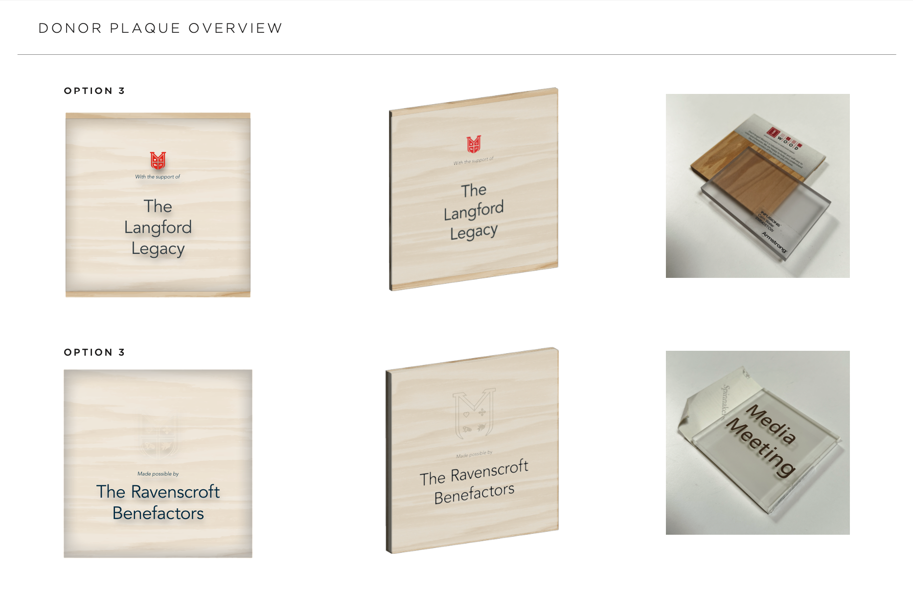USING PRE-ESTABLISHED SIGNAGE SYSTEMS AND BRANDING, DESIGNED DONATION PLAQUES INTENDED TO HONOR DONORS WHILE SELECTING MATERIALS THAT ARE COHESIVE TO THE ARCHITECTURAL PLANS.